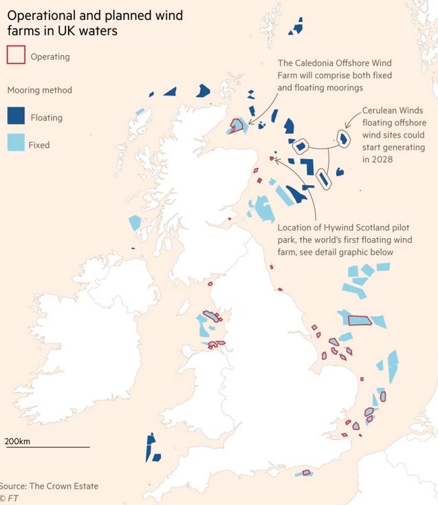 Μέχρι στιγμής, 29 πλωτά έργα έχουν εξασφαλίσει συμφωνίες μίσθωσης υποθαλάσσιων εκτάσεων από τα 51 που βρίσκονται σε εξέλιξη, συνολικής χωρητικότητας 37GW, σύμφωνα με τον φορέα της βιομηχανίας ΑΠΕ, RenewableUK. Η συντριπτική πλειοψηφία αυτών βρίσκεται στη Σκωτία, που ήδη αποτελεί παγκόσμιο κόμβο για την υπεράκτια αιολική βιομηχανία, με τα περισσότερα έργα να βρίσκονται σε πολύ πρώιμο στάδιο.
