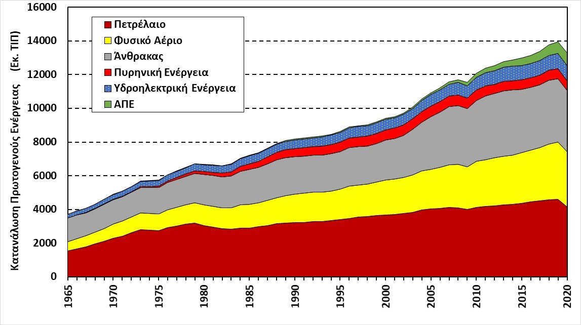 Εξετάζοντας τα διαθέσιμα πρόσφατα στοιχεία, όπως αυτά δίνονται από το Διεθνές Γραφείο Ενέργειας (International Energy Agency) [IEA, 2021], τη Eurostat [2021] και τη Διεύθυνση Ενεργειακών Πληροφοριών των Η.Π.Α. (U.S. Energy Information Administration) [EIA, 2021] για την περίοδο 1965-2020 καταγράφεται μια εντυπωσιακή αύξηση στην κατανάλωση πρωτογενούς ενέργειας. Πιο συγκεκριμένα, σημειώνεται μεταβολή από περίπου 3500 Mtoe σε 14000 Mtoe, Σχήμα (1), δηλαδή τετραπλασιασμός της κατανάλωσης πρωτογενούς ενέργειας σε χρονικό διάστημα 55 ετών. (Να διευκρινιστεί ότι ως “πρωτογενής ενέργεια” ορίζεται η ενέργεια των πρώτων υλών όπως αυτές λαμβάνονται από τη φύση (π.χ. εξόρυξη λιγνίτη, άντληση αργού πετρελαίου, κ.λπ.), ενώ το Mtoe είναι μονάδα ενέργειας, που χρησιμοποιείται στην ανάλυση ενεργειακών μεγεθών σε πλανητικό επίπεδο και αντιστοιχεί σε ένα εκατομμύριο toe, όπου το 1 toe (1 Τ.Ι.Π. ή Τόνος Ισοδυνάμου Πετρελαίου) αντιπροσωπεύει τη χημική ενέργεια από την πλήρη καύση ενός τόνου πετρελαίου ή ισοδύναμα ισούται περίπου με ≈11600kWh.) Παρατηρώντας δε πιο προσεκτικά τα δεδομένα του Σχήματος (1) μπορεί κάποιος να εντοπίσει τη σημαντική μείωση κατά περίπου 5% της ενεργειακής κατανάλωσης μεταξύ 2019 και 2020, αποτέλεσμα των επιπτώσεων της πανδημίας COVID-19 στις ανθρώπινες δραστηριότητες. Αξίζει να σημειωθεί ότι η καταγραφόμενη μείωση της ενεργειακής κατανάλωσης τη χρονική περίοδο 2019-2020 είναι σαφώς εντονότερη από την αντίστοιχη μείωση της χρονικής περιόδου της μεγάλης οικονομικής κρίσης του 2008-2010.