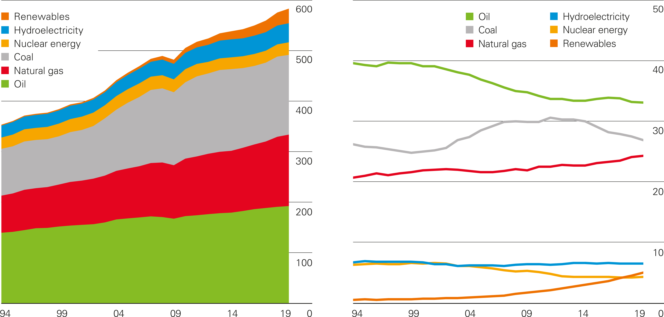 | Σχήμα 2: (α) Πλανητική Κατανάλωση Ενέργειας (1994-2019) σε Exajoules (EJ), πηγή BP statistics και (β) Διαχρονική Ποσοστιαία Μεταβολή του Πλανητικού Ενεργειακού Μείγματος |