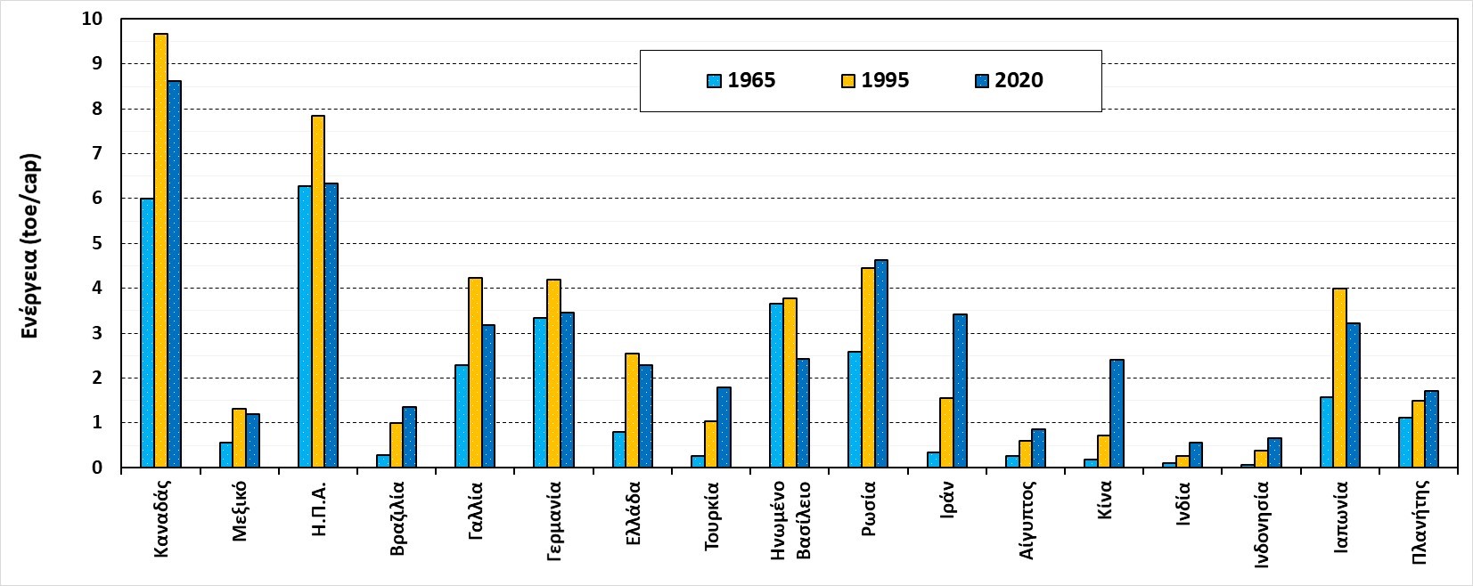 Αναλύοντας στη συνέχεια την κατά κεφαλήν ετήσια κατανάλωση πρωτογενούς ενέργειας (Σχήμα (3)) για ορισμένες αντιπροσωπευτικές περιοχές του πλανήτη μας για τη χρονική περίοδο 1965-2020 καταγράφονται ορισμένα εντυπωσιακά αποτελέσματα. Πιο συγκεκριμένα: