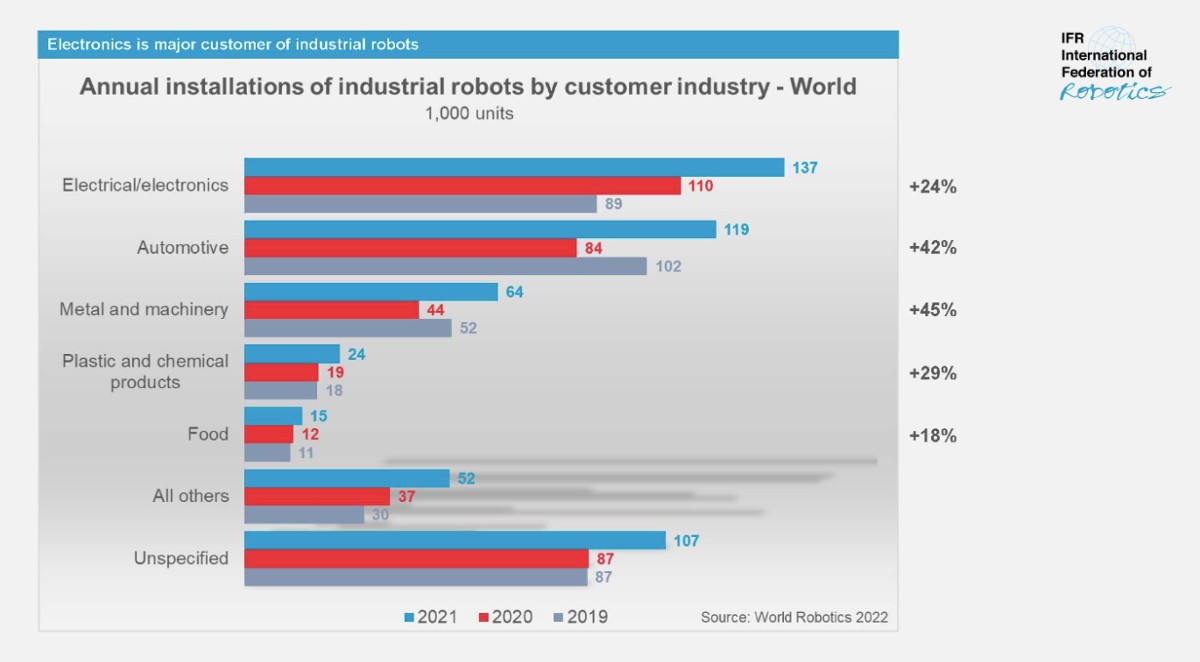 Η μεγαλύτερη αύξηση σημειώθηκε στην Κίνα, η βιομηχανία της οποίας απορρόφησε πάνω από το 50% των νέων ρομπότ, με 62.000 από αυτά να απορροφώνται στην αυτοκινητοβιομηχανία (σε ρυθμό διπλάσιο από πέρυσι). Ακολουθούν η τεχνολογικά προηγμένη Ιαπωνία, οι ΗΠΑ η Νότια Κορέα, και από ευρωπαϊκής πλευράς η Γερμανία και η γειτονική Ιταλία. Ειδικά στην Ευρώπη, οι νέες εγκαταστάσεις βιομηχανικών ρομπότ το 2021 αυξήθηκαν κατά 24%, με τη Γερμανία να αποκτά ποσοστό 28% του ευρωπαϊκού συνόλου, την Ιταλία 17% και τη Γαλλία 7%.