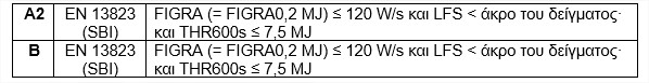 Class A2, «When tested in accordance with EN 13823 every class A2 product shall satisfy the same criteria as class B»,Β. Σύμφωνα με το πρότυπο ταξινόμησης ΕΝ 13501-1 παρ. 11.7.1: