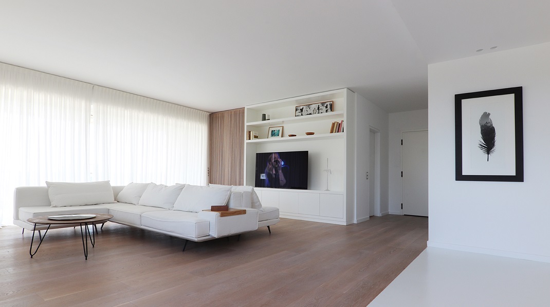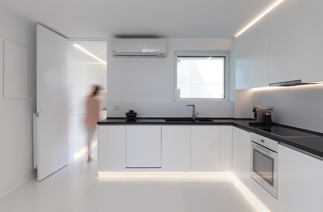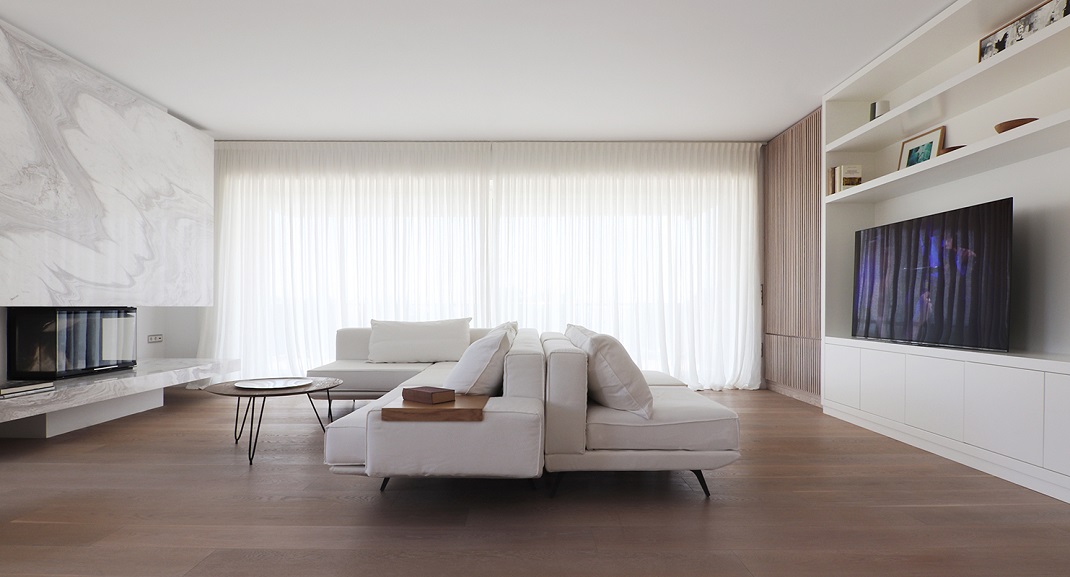 Το καθιστικό επεκτάθηκε. Η τραπεζαρία ενώθηκε οπτικά με την κουζίνα, δημιουργώντας ένα λευκό φόντο, και διαχωρίζονται με ένα γαλακτερό συρόμενο τζάμι. Ο τοίχος στο βάθος της τραπεζαρίας επενδύθηκε με μάρμαρο τύπου Βόλακα. Αυτό λειτουργεί ως ένας φυσικός πίνακας στον χώρο, προσδίδοντας ένταση και χαρακτήρα στο λευκό υπόβαθρο.