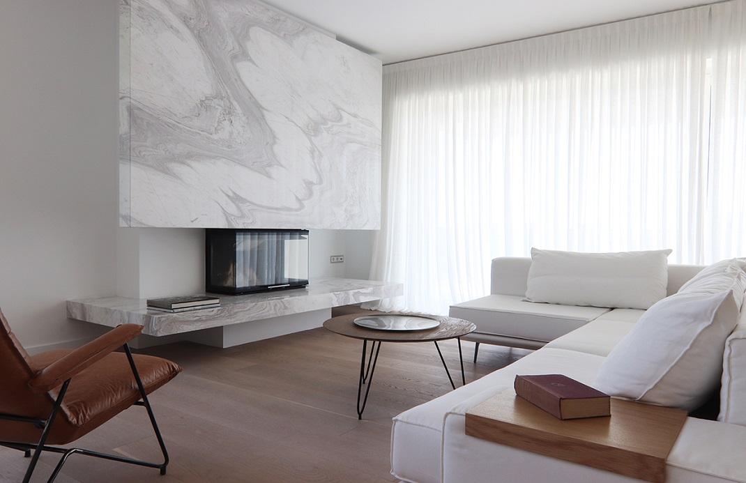 Στην άλλη πλευρά του σαλονιού, το μαρμάρινο τζάκι κυριαρχεί στον χώρο και ξεχωρίζει στο ξύλινο δάπεδο, δίνοντας την εντύπωση ότι αιωρείται.