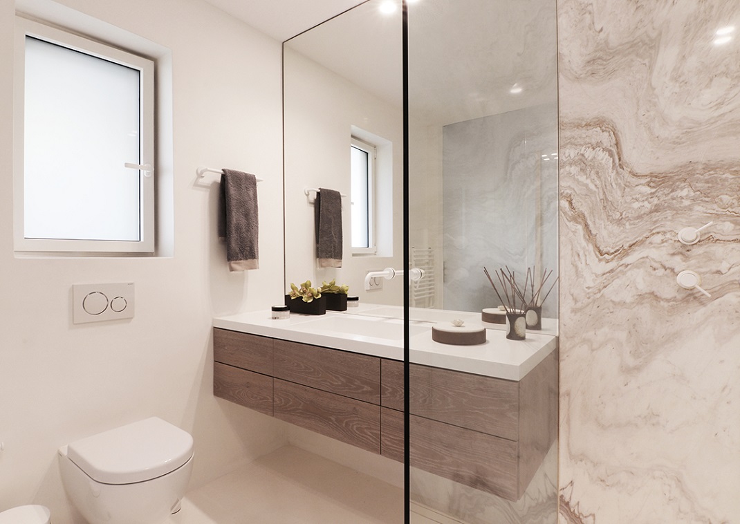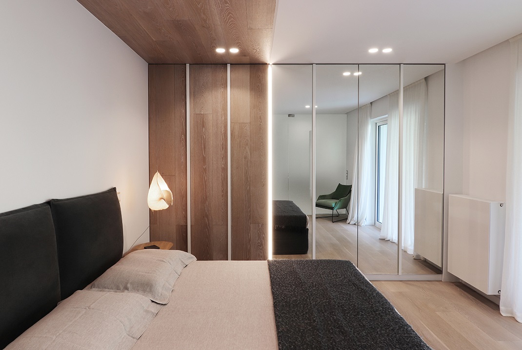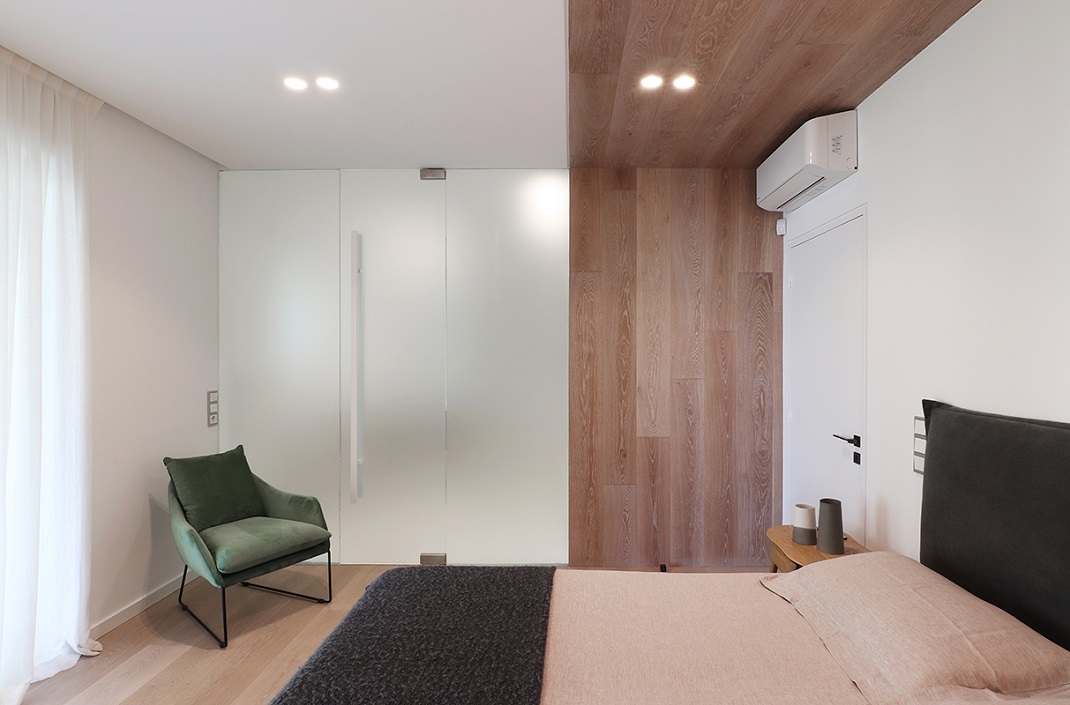 Εδώ, ο διαχωρισμός του μπάνιου με το υπνοδωμάτιο γίνεται πάλι με ένα γαλακτερό τζάμι, το οποίο προσθέτει στον κύριο χώρο οπτικό βάθος και φως. Αυτά τα χαρακτηριστικά του χώρου τονίζονται επιπλέον με τις αντανακλάσεις του καθρέφτη που καλύπτουν την ντουλάπα.