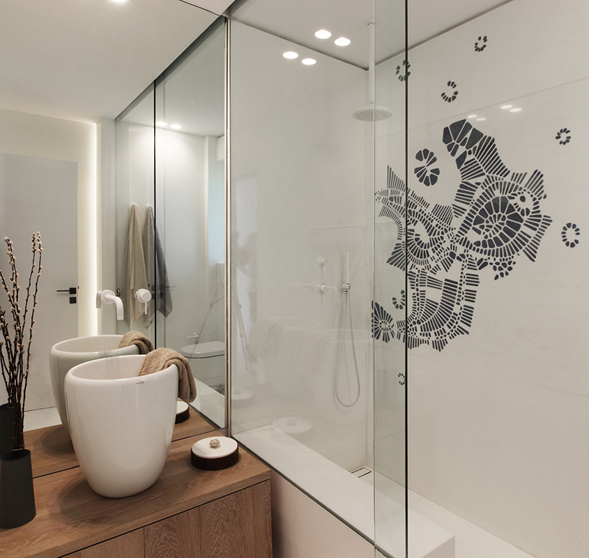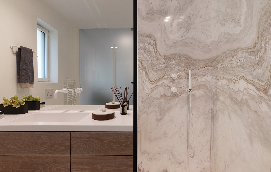 Έτσι, οι KKMK Architects σχεδίασαν ένα μοναδικό μαρμάρινο μωσαϊκό με το οποίο επενδύθηκε ο τοίχος του ντούζ. Το μωσαϊκό Possi κατασκευάστηκε συνδυάζοντας ελληνικό λευκό μάρμαρο και μπλε μάρμαρο τύπου Macauba, το οποίο έδωσε ένα σύγχρονο και οργανικό χαρακτήρα στο μπάνιο και μια νότα μεσογειακής αισθητικής.