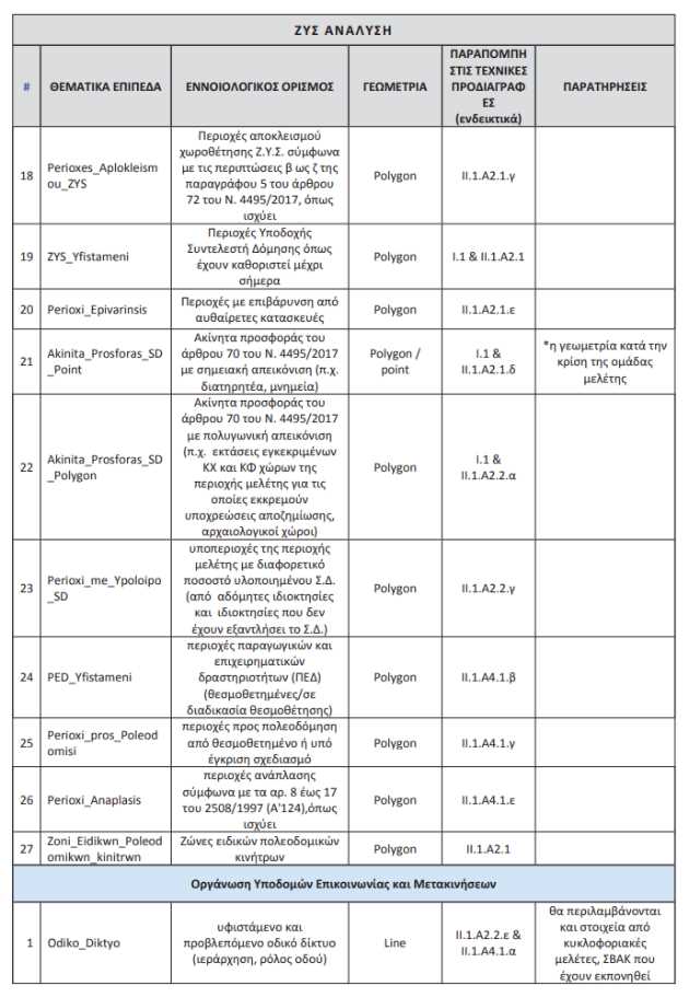 Για τα Στάδια της Ανάλυσης και της Πρότασης της κάθε μελέτης, ορίζεται πλήθος θεματικών επιπέδων (layers) (βλ. Παράρτημα) για τα αρχεία διανυσματικής πληροφορίας (vector) που θα χρησιμοποιηθούν για τη σύνταξη της μελέτης. Κατά την κρίση των μελετητών δύναται να δημιουργούνται επιπρόσθετα θεματικά επίπεδα. Τα θεματικά επίπεδα θα συνοδεύονται από κατάλογο/ πίνακα ιδιοτήτων ενσωματώνοντας το σύνολο της περιγραφικής πληροφορίας που κρίνεται απαραίτητη για την χαρτογραφική απεικόνισή τους, καθώς και οποιοδήποτε άλλο περιγραφικό στοιχείο κριθεί απαραίτητο.