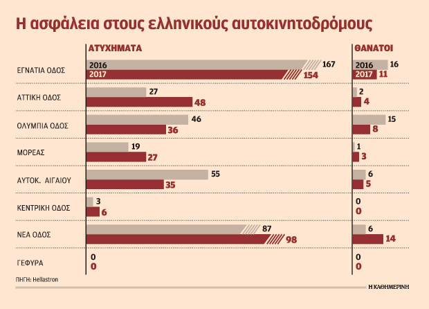 Αυτά, ενώ τίθενται σημαντικά ερωτήματα για την ασφάλεια διέλευσης των οχημάτων και των οδηγών, με βάση τα στοιχεία της Hellastron, της ένωσης διαχειριστών ελληνικών οδικών αξόνων, που δείχνουν πως η Εγνατία έχει τα περισσότερα τροχαία ατυχήματα από κάθε άλλο μεγάλο ελληνικό οδικό άξονα (154 το 2017) και δυστυχώς με νεκρούς (11 το 2017, μετά τη Νέα Οδό με 14).