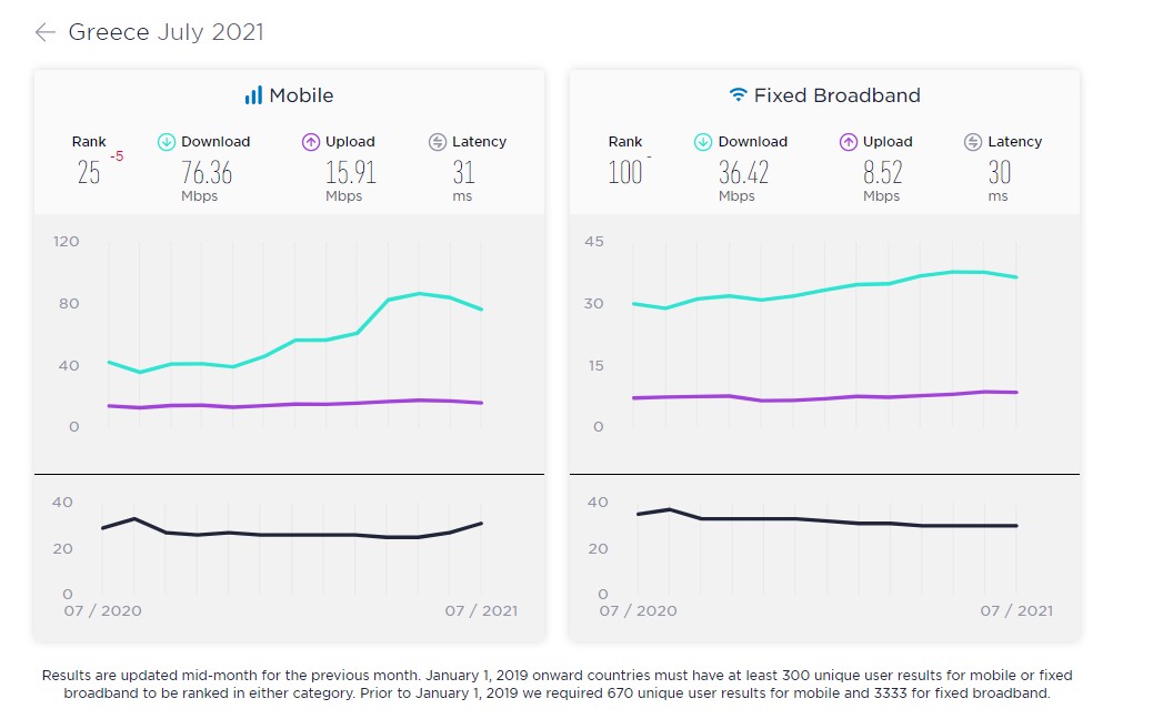 Πάντως, παρά τις θετικές της επιδόσεις, η Ελλάδα υποχώρησε μέσα σε έναν χρόνο (Ιούλιος 2021-Ιούλιος 2020) κατά πέντε θέσεις στην παγκόσμια κατάταξη όσον αφορά τις ταχύτητες του κινητού Internet.