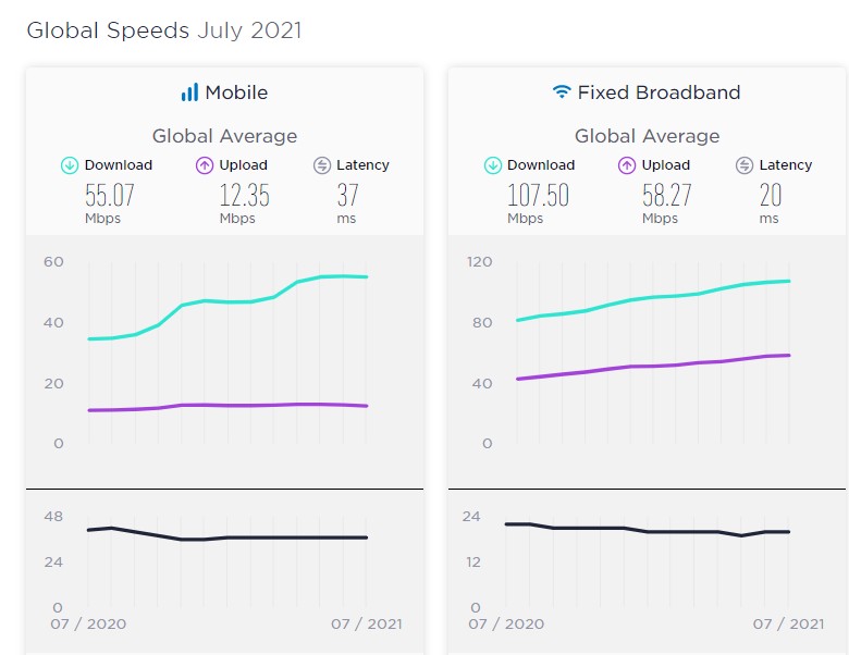 Ο πλανήτης ανεβάζει σταθερά ταχύτητα στο Internet τα τελευταία χρόνια. Η μέση ταχύτητα λήψης μέσω κινητού τηλεφώνου ήταν κατά 98,9% γρηγορότερη τον Ιούλιο του 2021 σε σχέση με τον Ιούλιο του 2019, κατά 141,4% ταχύτερη σε σύγκριση με τον Ιούλιο του του 2018 και κατά 194,0% ταχύτερη έναντι του Ιουνίου του 2017.