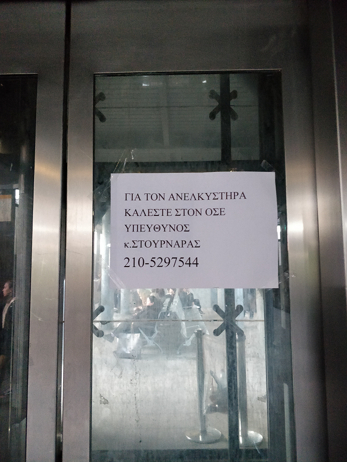 Εδώ, η τέχνη του «δεν είναι δική μου ευθύνη» κορυφώνεται αφού στην πόρτα του ασανσέρ κάποιος έχει κολλήσει ένα χαρτί με το όνομα και το τηλέφωνο του υπεύθυνου της διεύθυνσης συντήρησης του ΟΣΕ. Αν αυτό έγινε με πρωτοβουλία της ΤΡΑΙΝΟΣΕ ή απλά του εργολάβου που έχει αναλάβει το εκδοτήριο εισιτηρίων του σταθμού είναι άγνωστο, σε κάθε περίπτωση όμως είναι κωμικοτραγικό.
